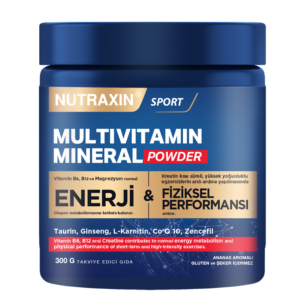 Nutraxin Multivitamin Mineral Energy; içeriğinde Ginseng, CoQ-10, L-Karnitin, Taurin, Zencefil, Turunçgil bioflavonoidleri, 14 vitamin ve 10 mineral bulunur. İçeriğindeki etken